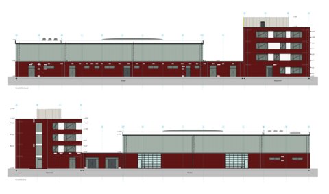 Der neue Gebäudekomplex wird neben einem Sozial- und Verwaltungsbereich auch verschiedene Besprechungs- und Schulungsräume erhalten. Im anschließenden eingeschossigen Mittelteil sind die gemeinsam genutzten Technikräume und zwei Werkstätten untergebracht. Die Hallenkonstruktion erhält einen eingestellten Massivkern für weitere Werkstätten. Auf den Werkstätten im 1. OG sind offene und geschlossene Lagerflächen vorgesehen.